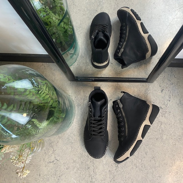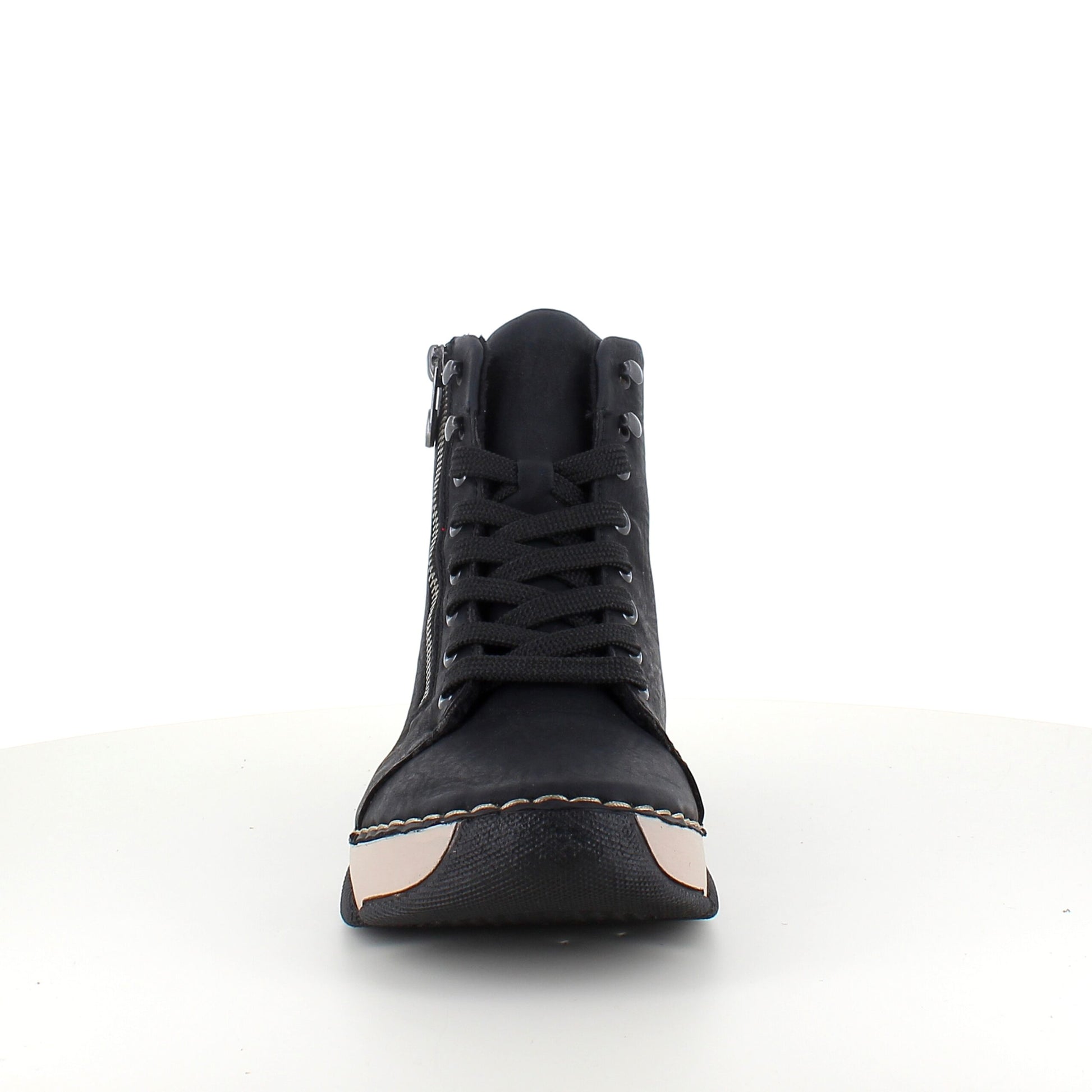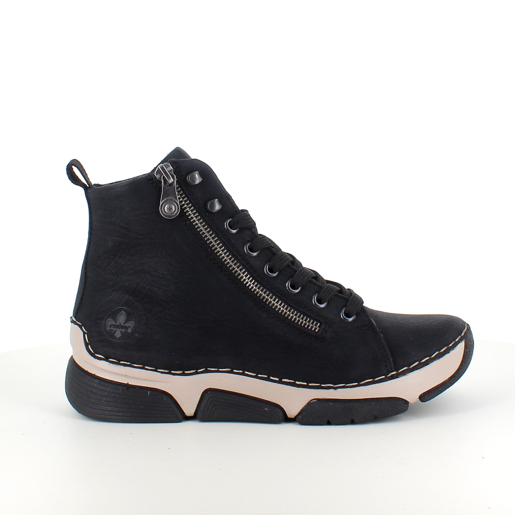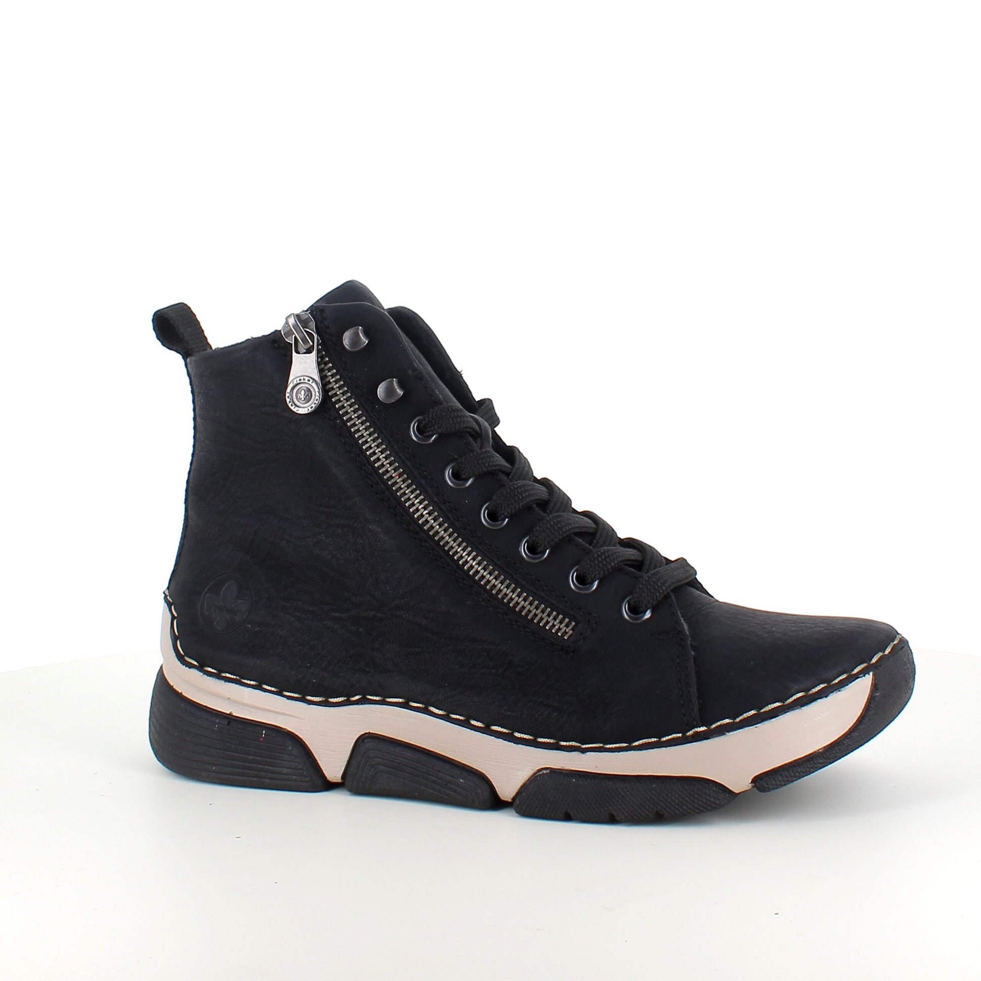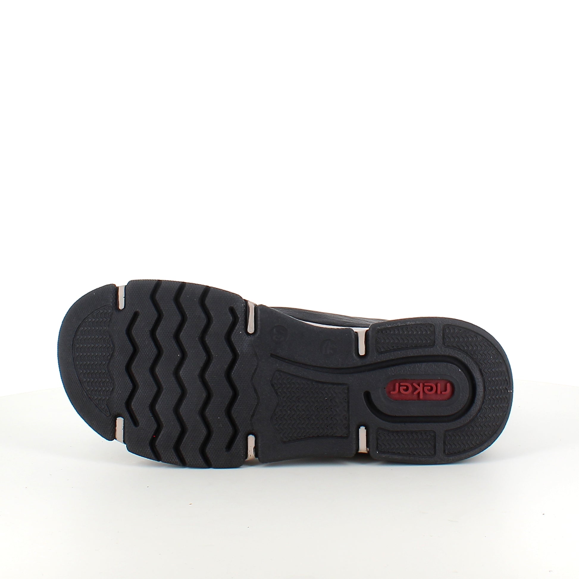 Indvendigt er den foret med let materiale og udstyret med en blød Rieker Antistress sål, der støtter fodens naturlige bevægelse og giver en behagelig følelse hele dagen.