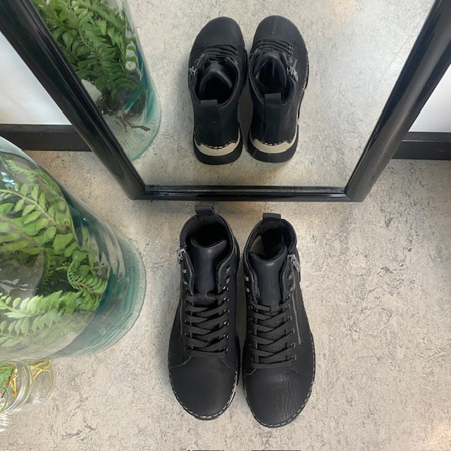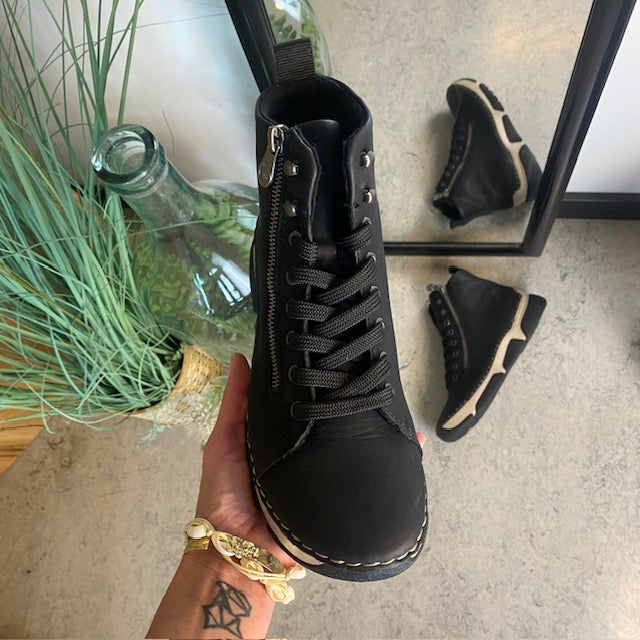 Støvlen har snørebånd og lynlås, så den er nem at tage af og på.