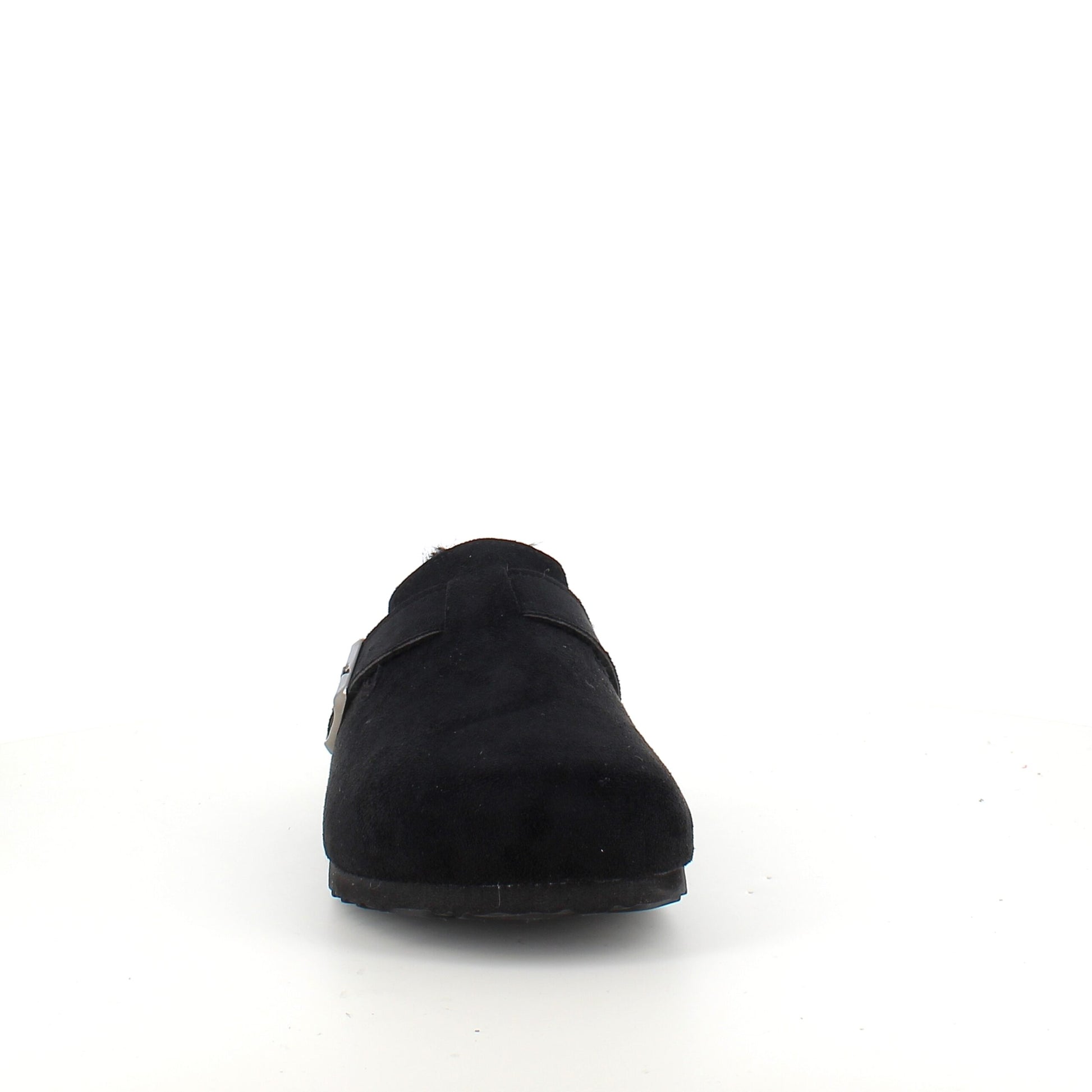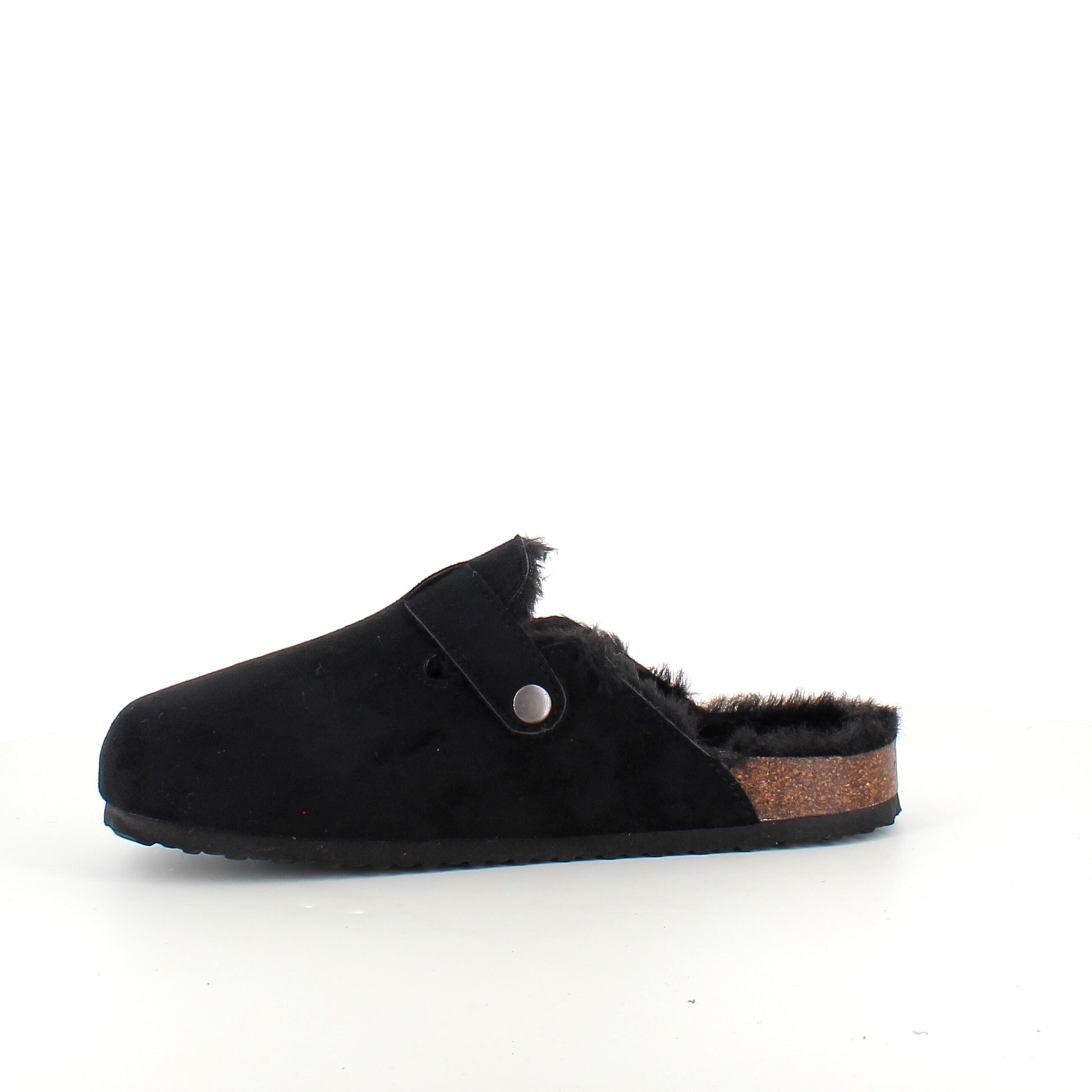 Sort Slip-on hjemmesko med en overdel i tekstil. Hjemmeskoen har en justerbar rem over forfoden Skoen er foret med blødt fleece for Mellemsålen er en korksål og ydersålen er en blød, rillet sål Sutskoen kommer i størrelserne 36-41