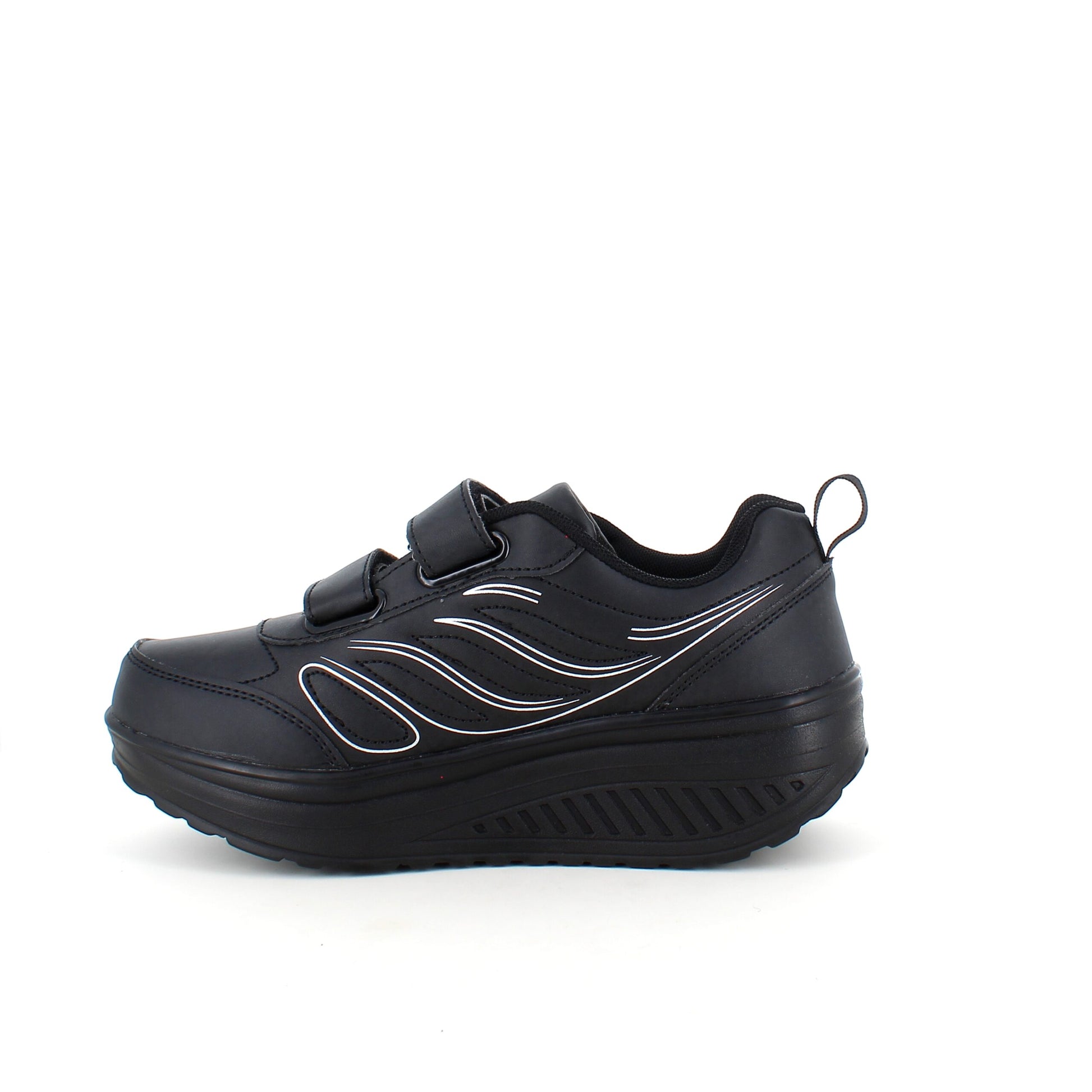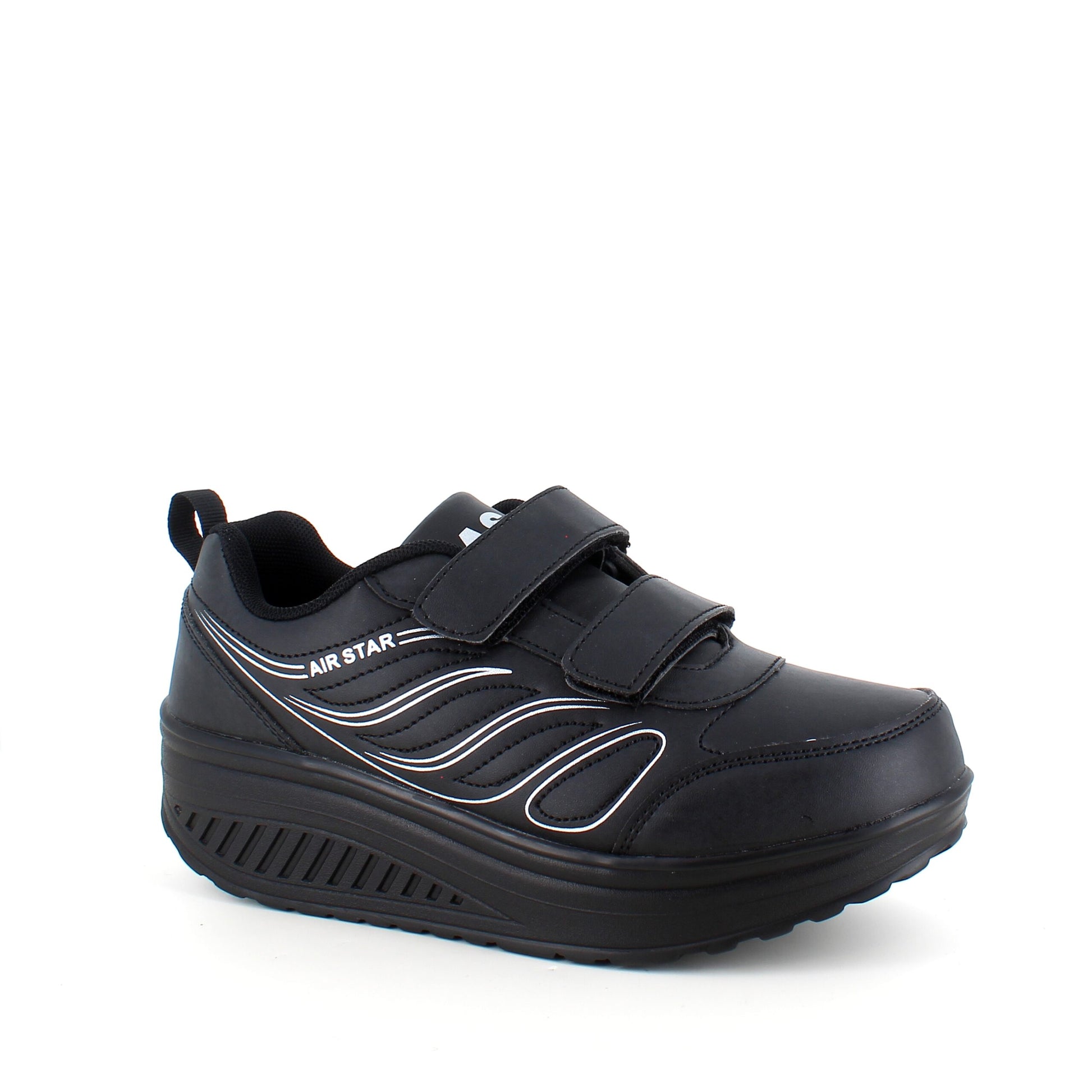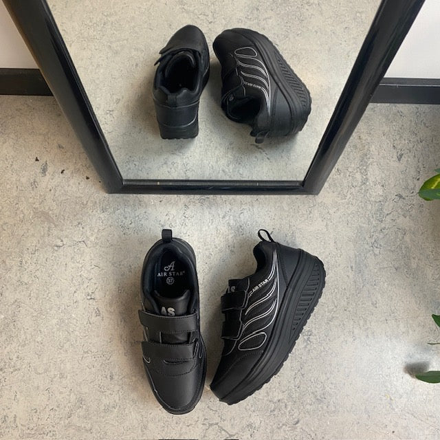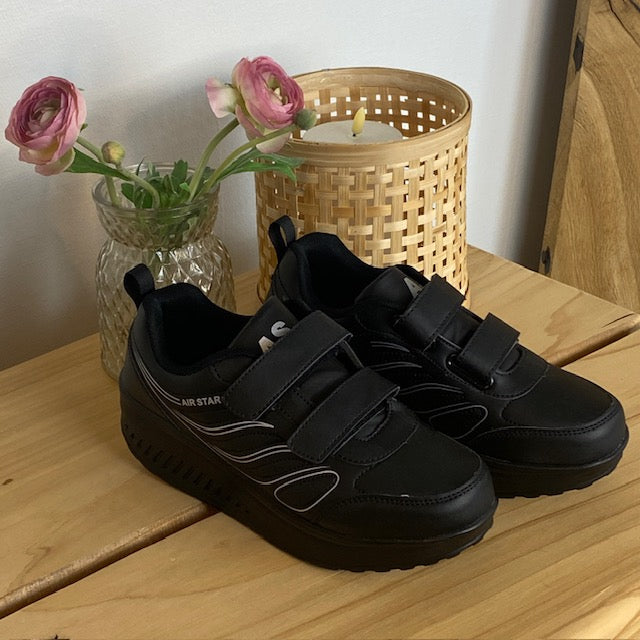 Sort sportssko med velcrolukning og gængesål.