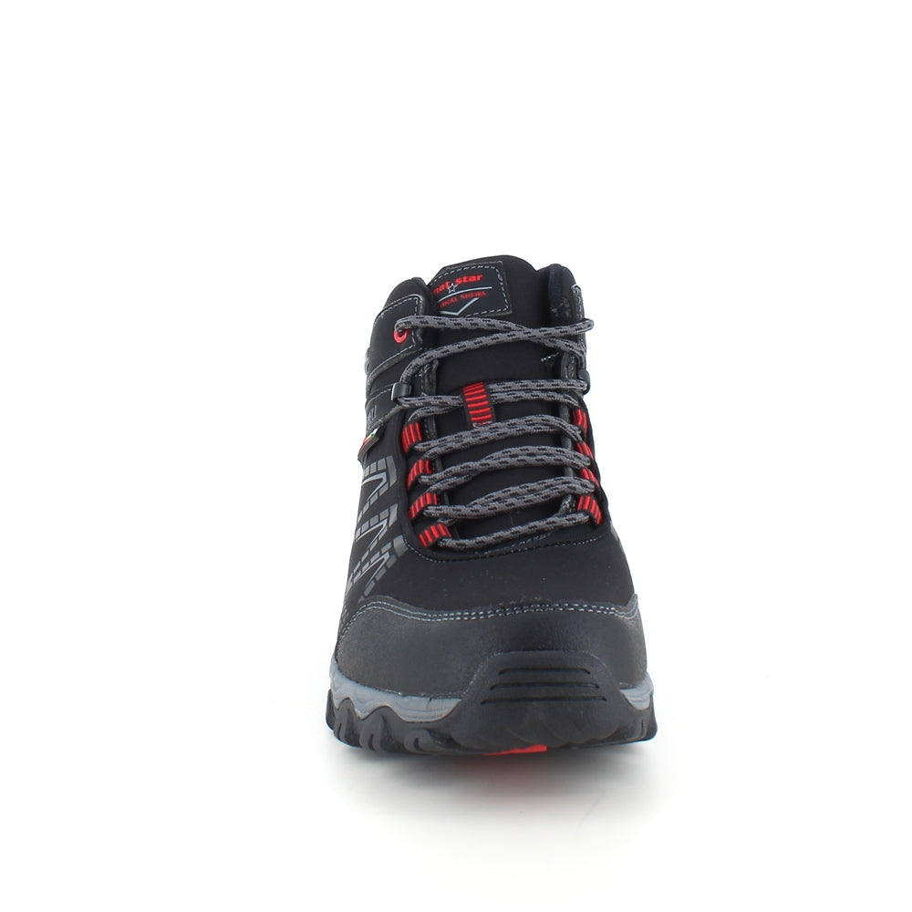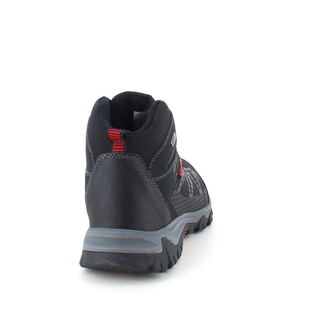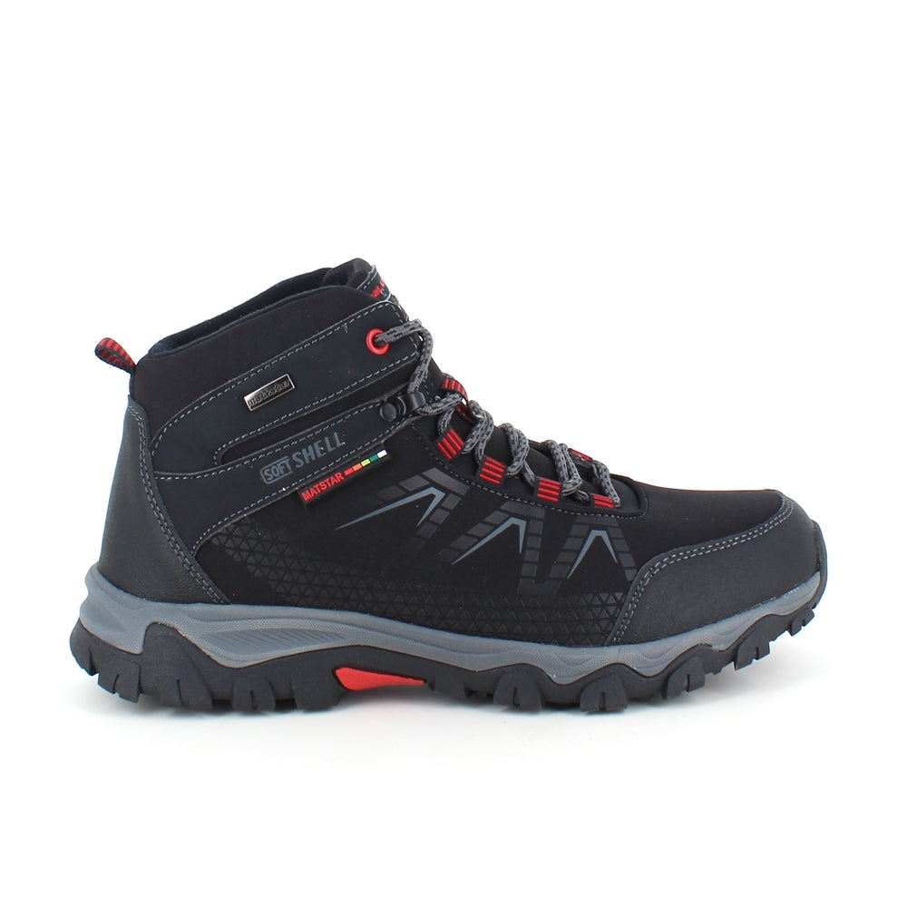 Sort vandrestøvle med røde detaljer og overdel i eftergiveligt softshell