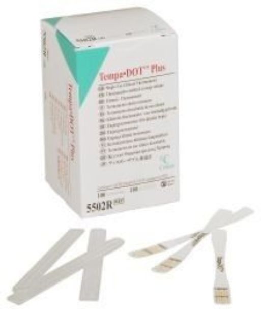 Disse engangstermometer af mærket Tempa-Dot Plus er både FDA-godkendt og CE certificeret.