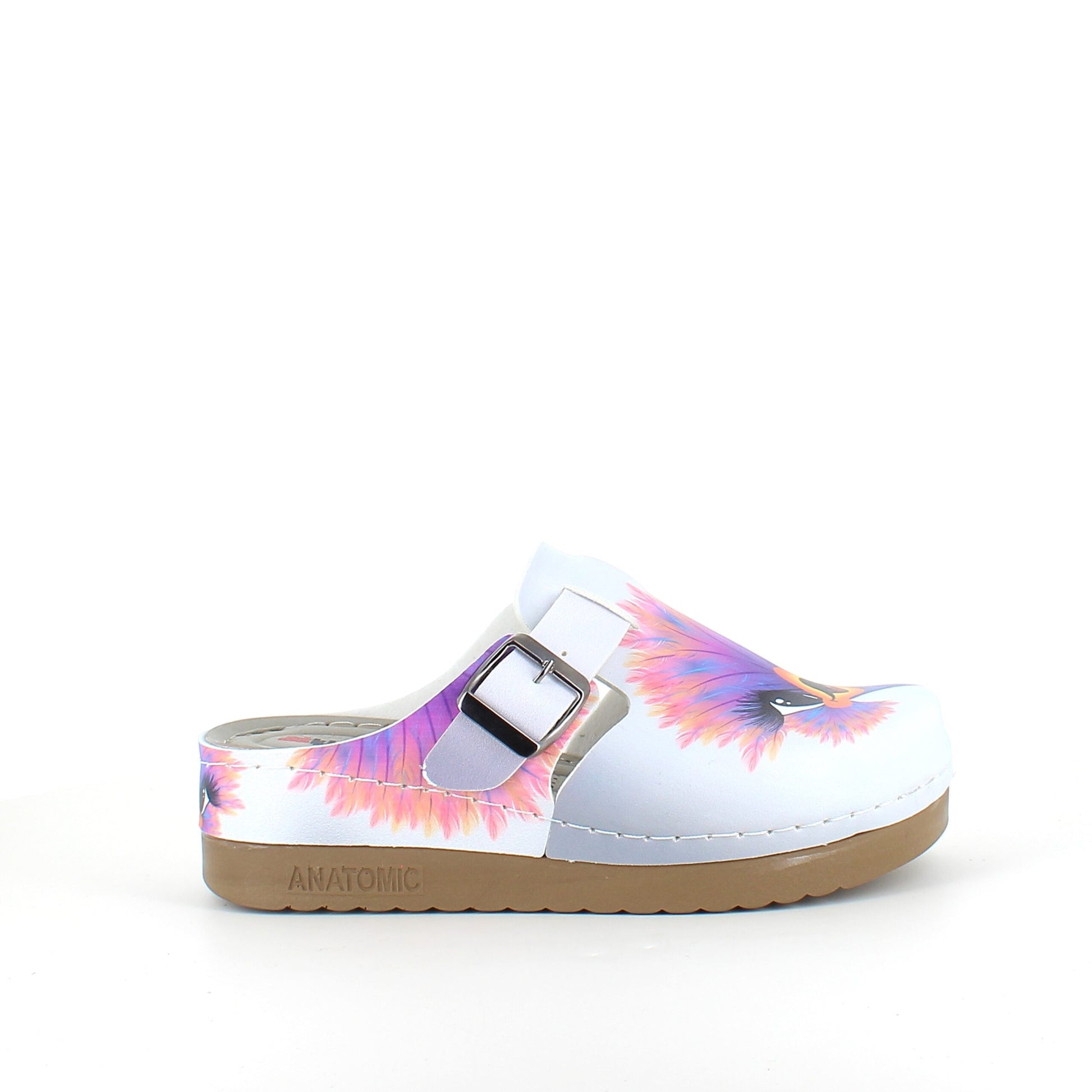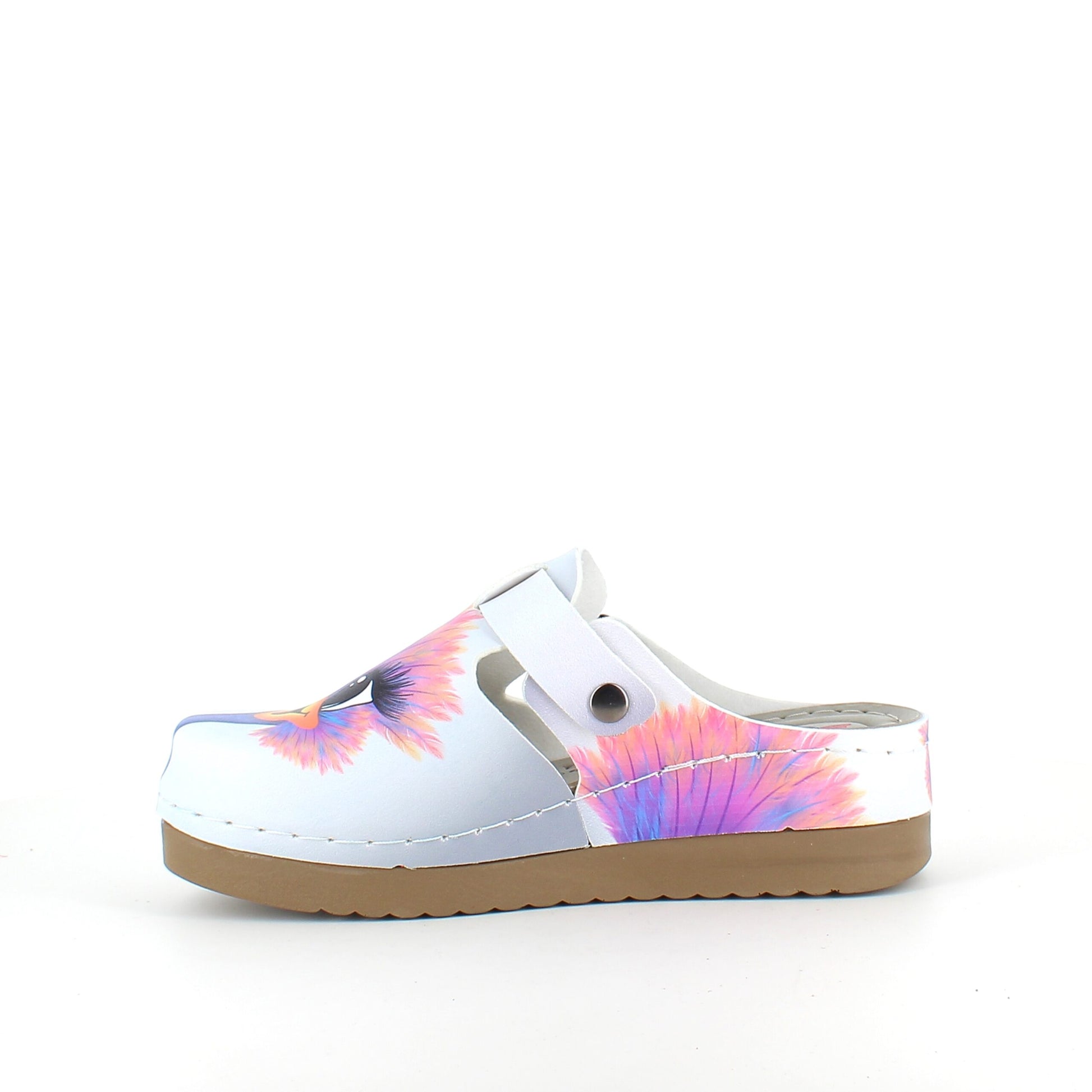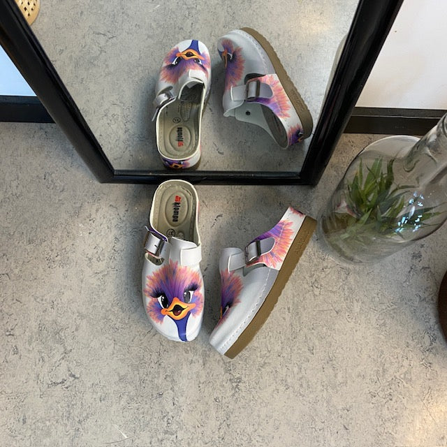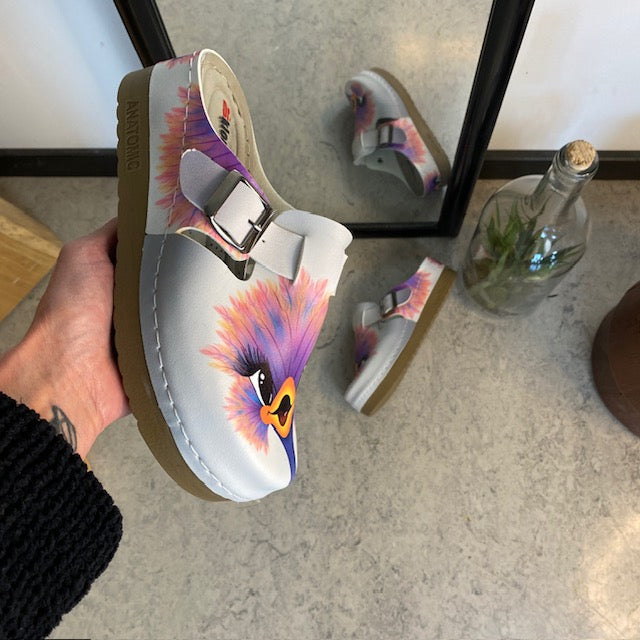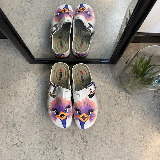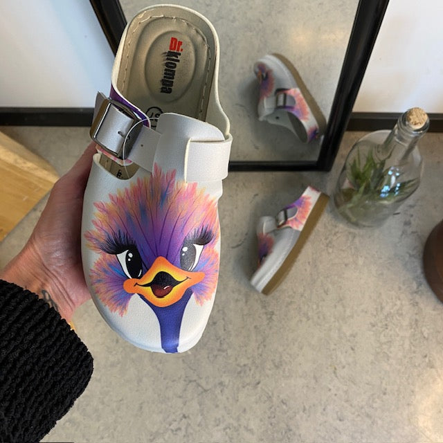 Træskoene har et print af en glad struds på overdelen.