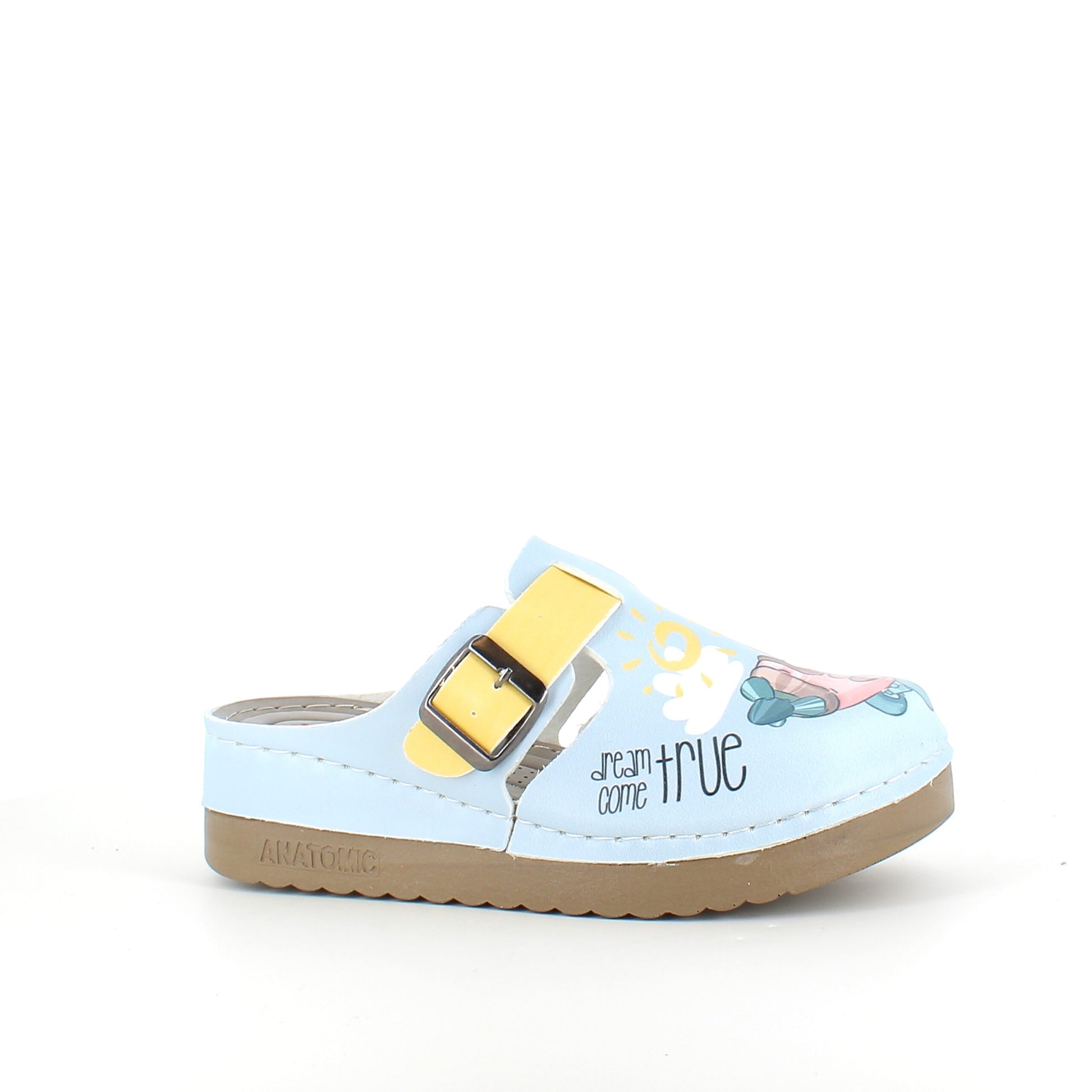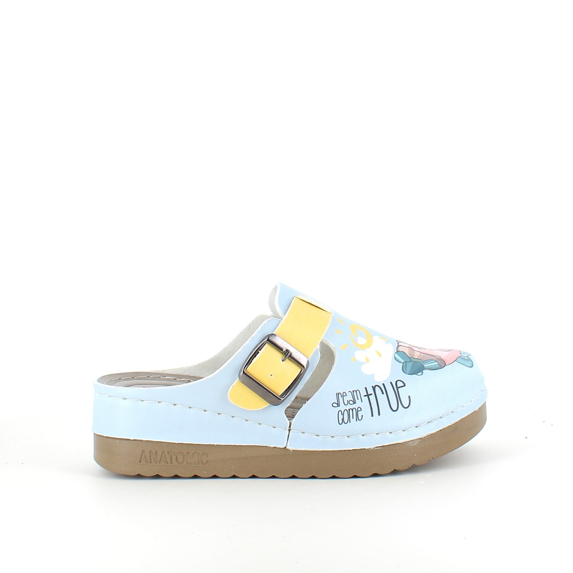 Citat på højre træsko: "Dream come true" på venstre træsko: "Happy time"