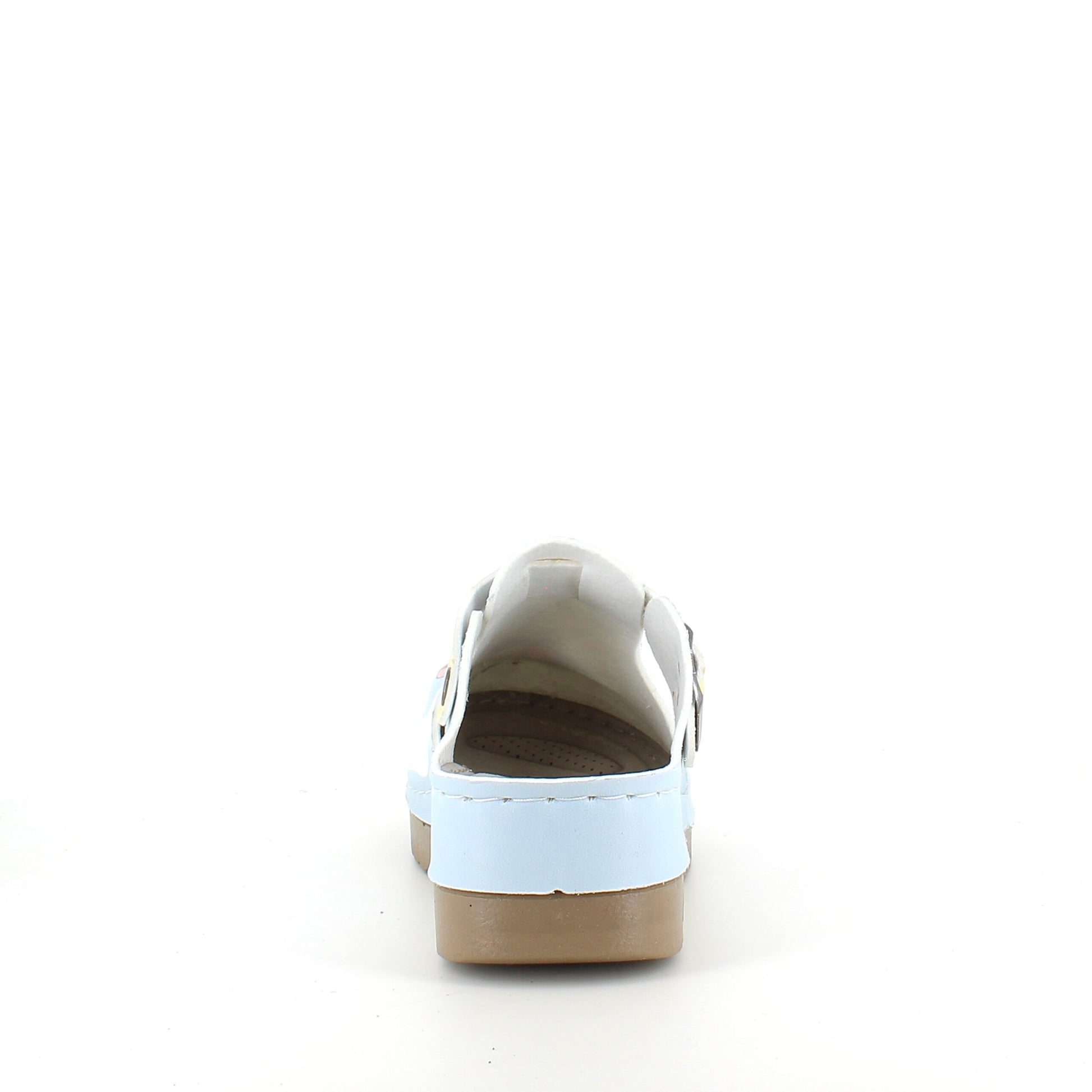 Træskoen har en lille kilehæl og måler 2cm ved forfoden og 4cm ved hælen