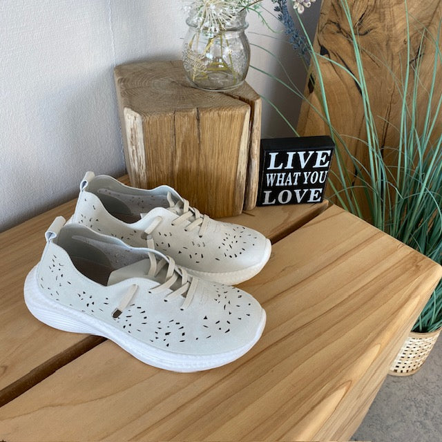 Denne stilrene og ultralette damesko forener moderne design med suveræn komfort – ideel til både arbejde og fritid. Det elegante ydre i cremefarvet kunstlæder prydes af et dekorativt, laserskåret mønster, som giver både et feminint udtryk og øget åndbarhed.