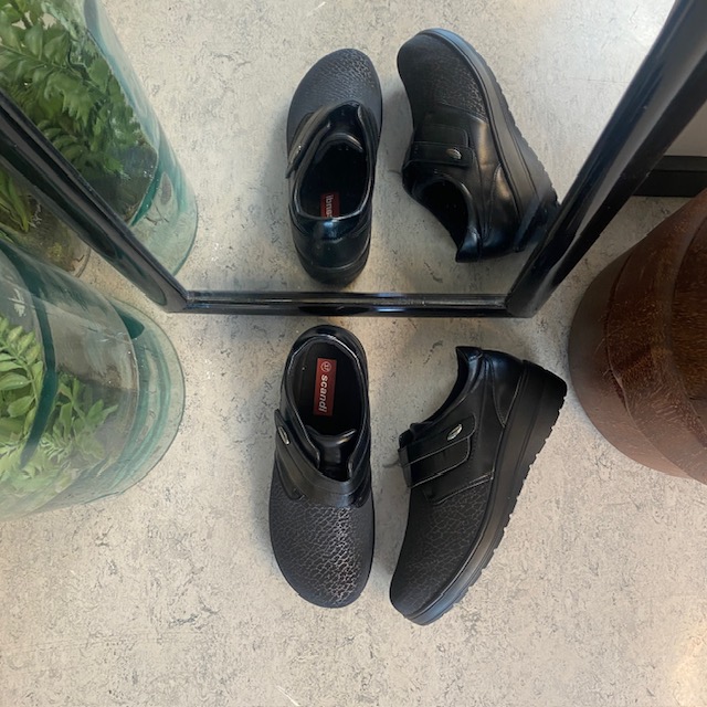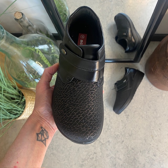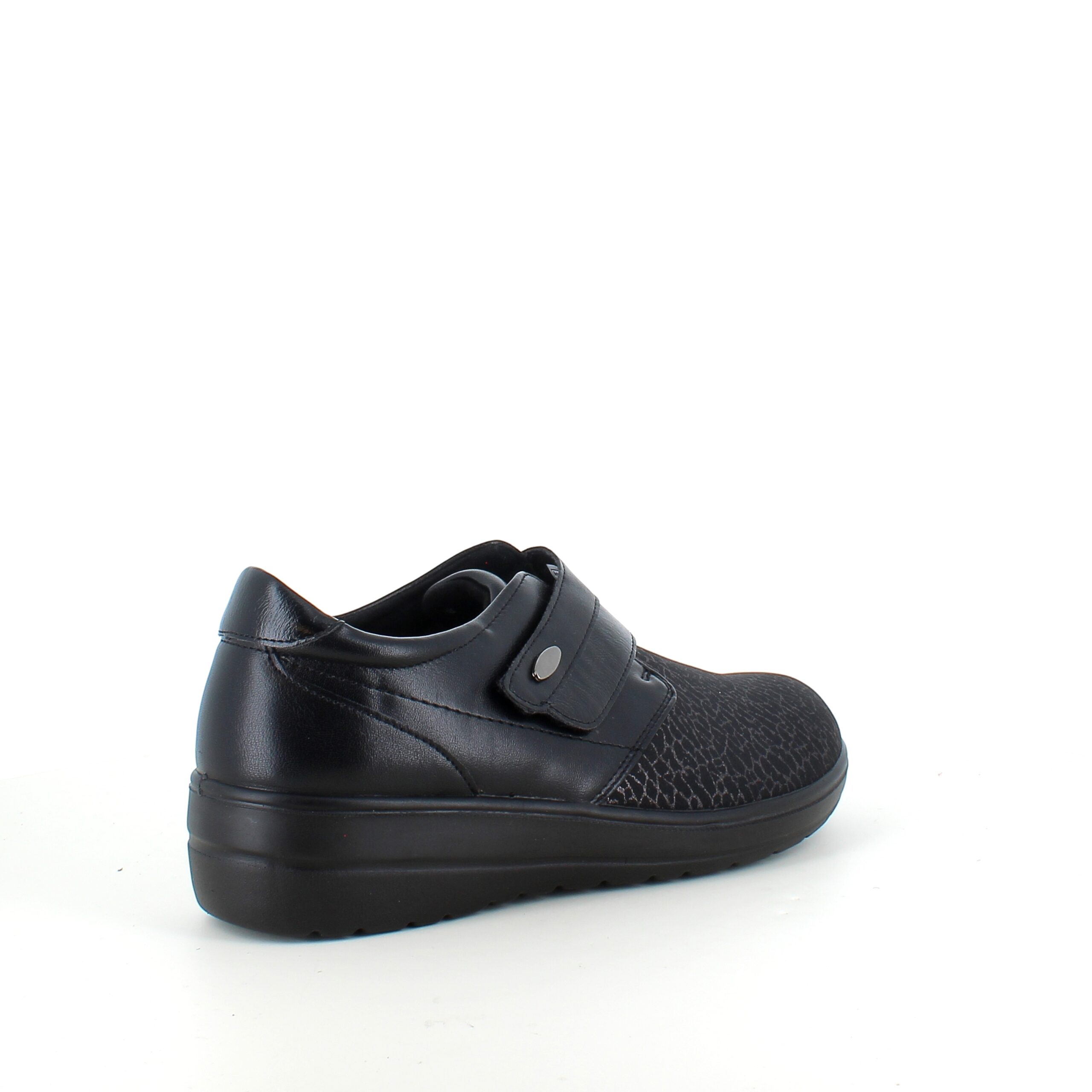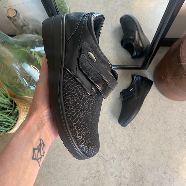 Damesko i sort PU med mønstret overdel, velcrolukning og fleksibel PU-sål