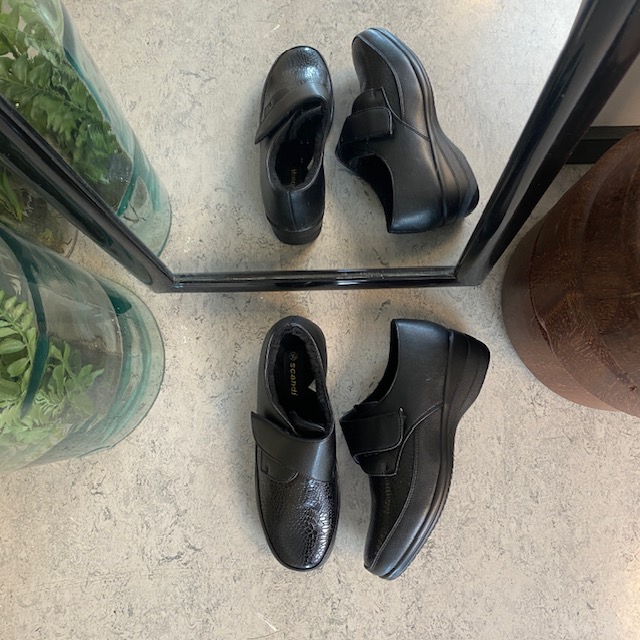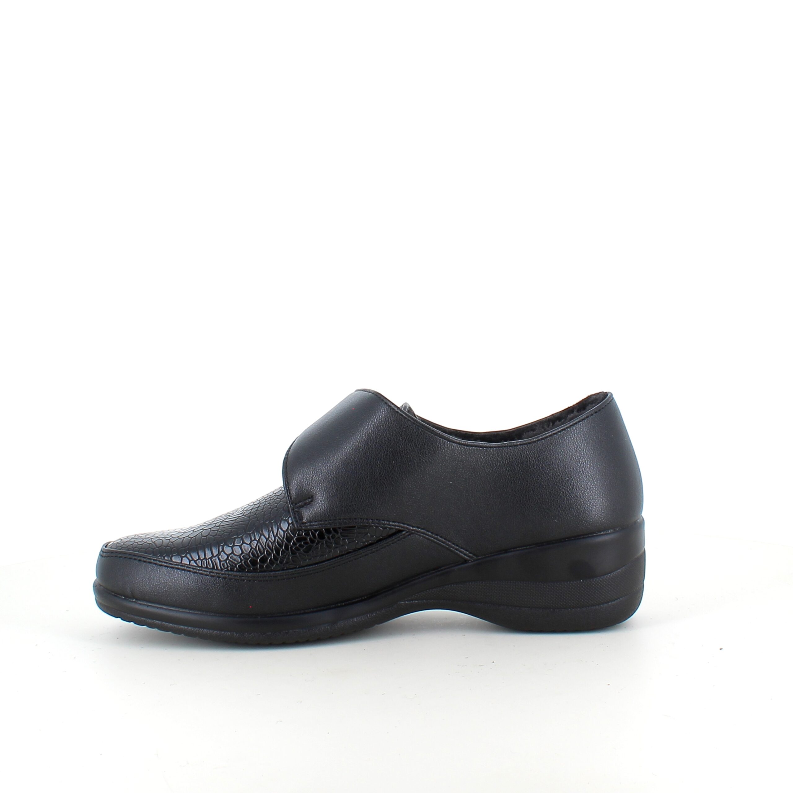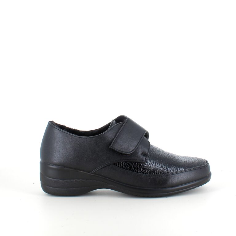 Overdelen er detaljeret med et elegant slangemønster, der giver et moderne look, mens den brede velcrolukning gør skoen nem at få af og på – også for dig, der har brug for ekstra rummelighed.
