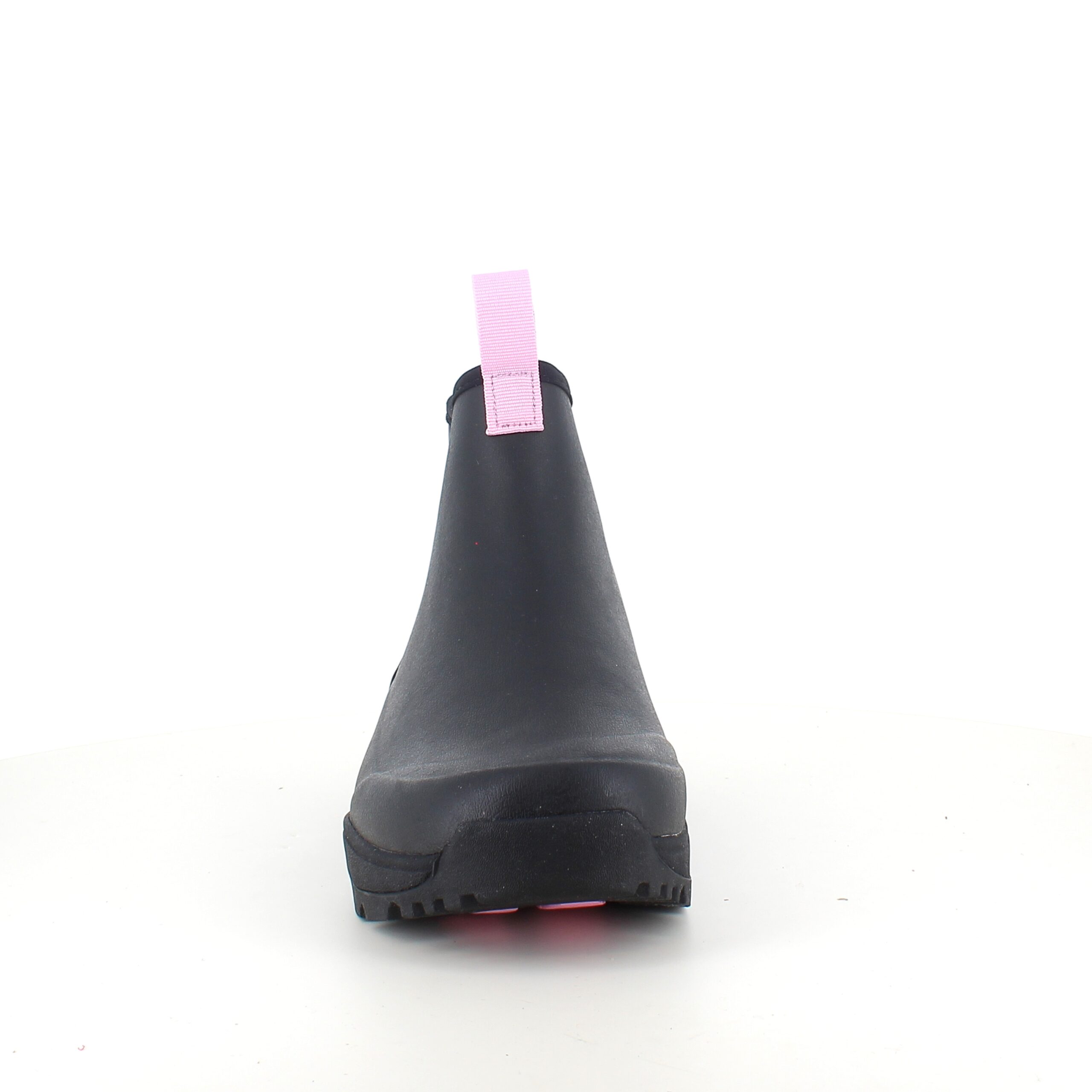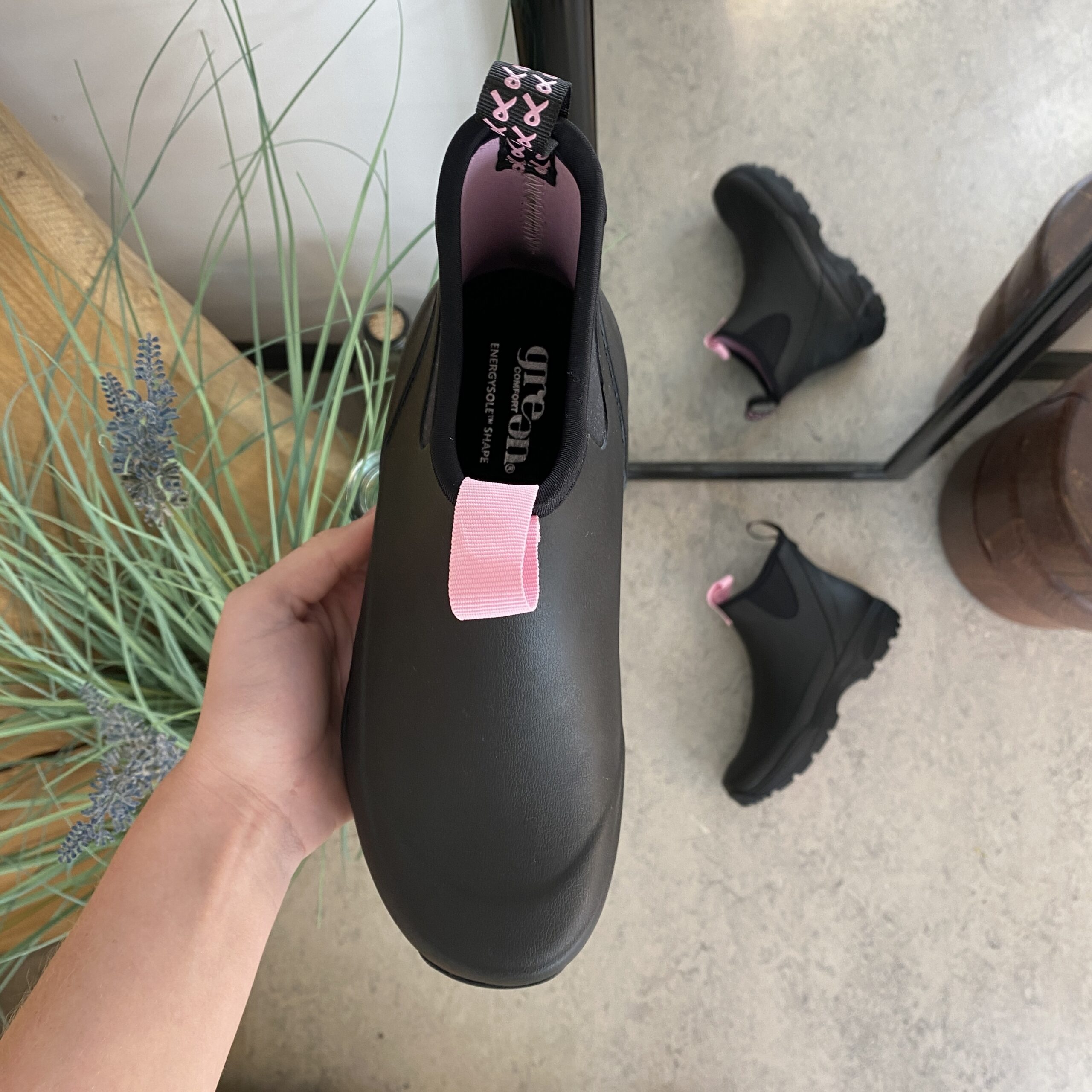 Oplev vores sorte gummistøvler, skabt med omtanke og i samarbejde med Støt Brysterne, hvor den genkendelige lyserøde farve elegant fremhæves i bunden af støvlen samt i den dekorative sløjfe, der pryder den ene strop.