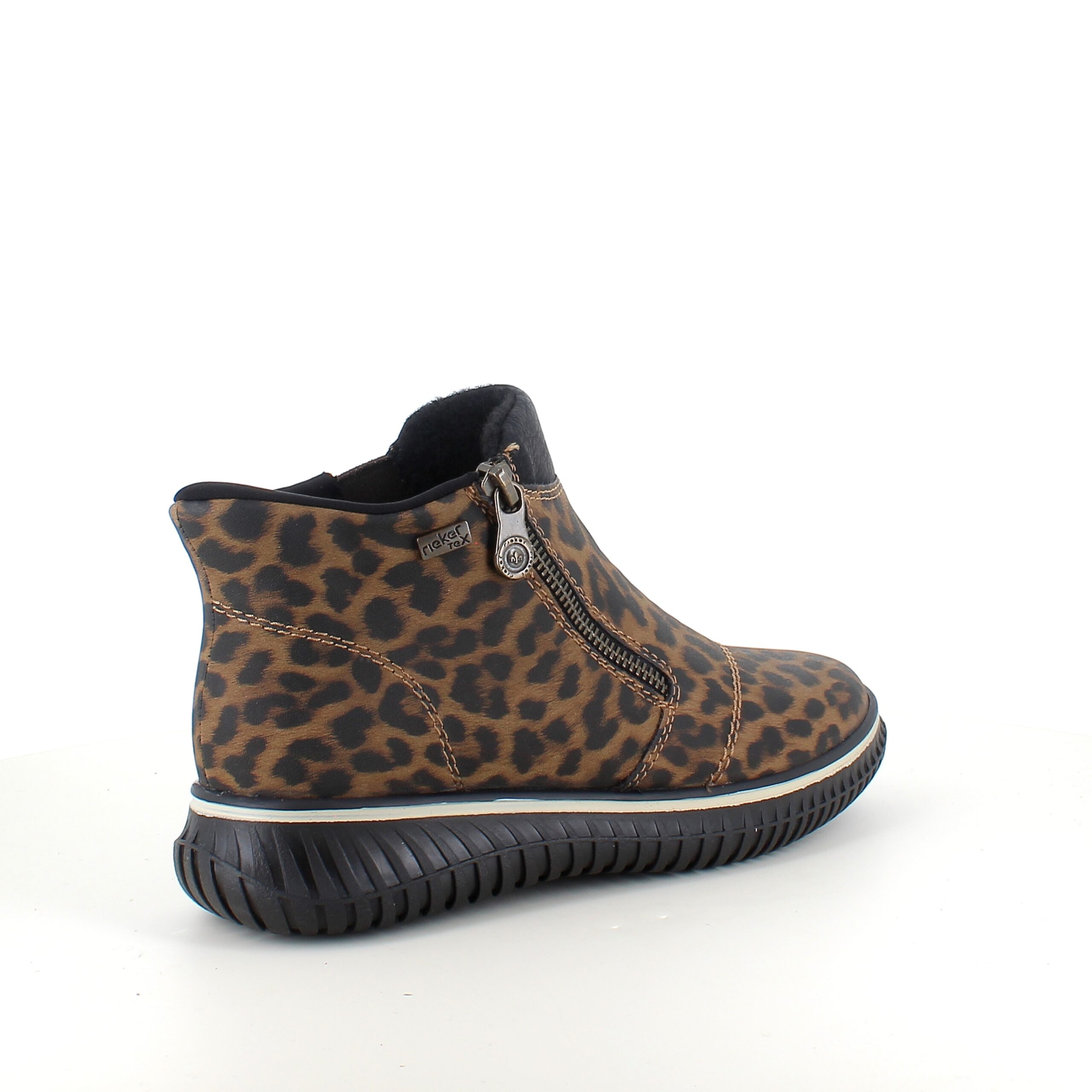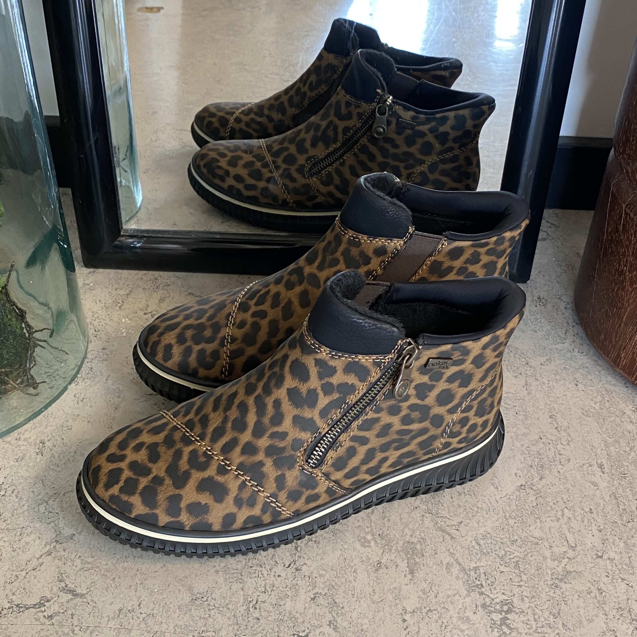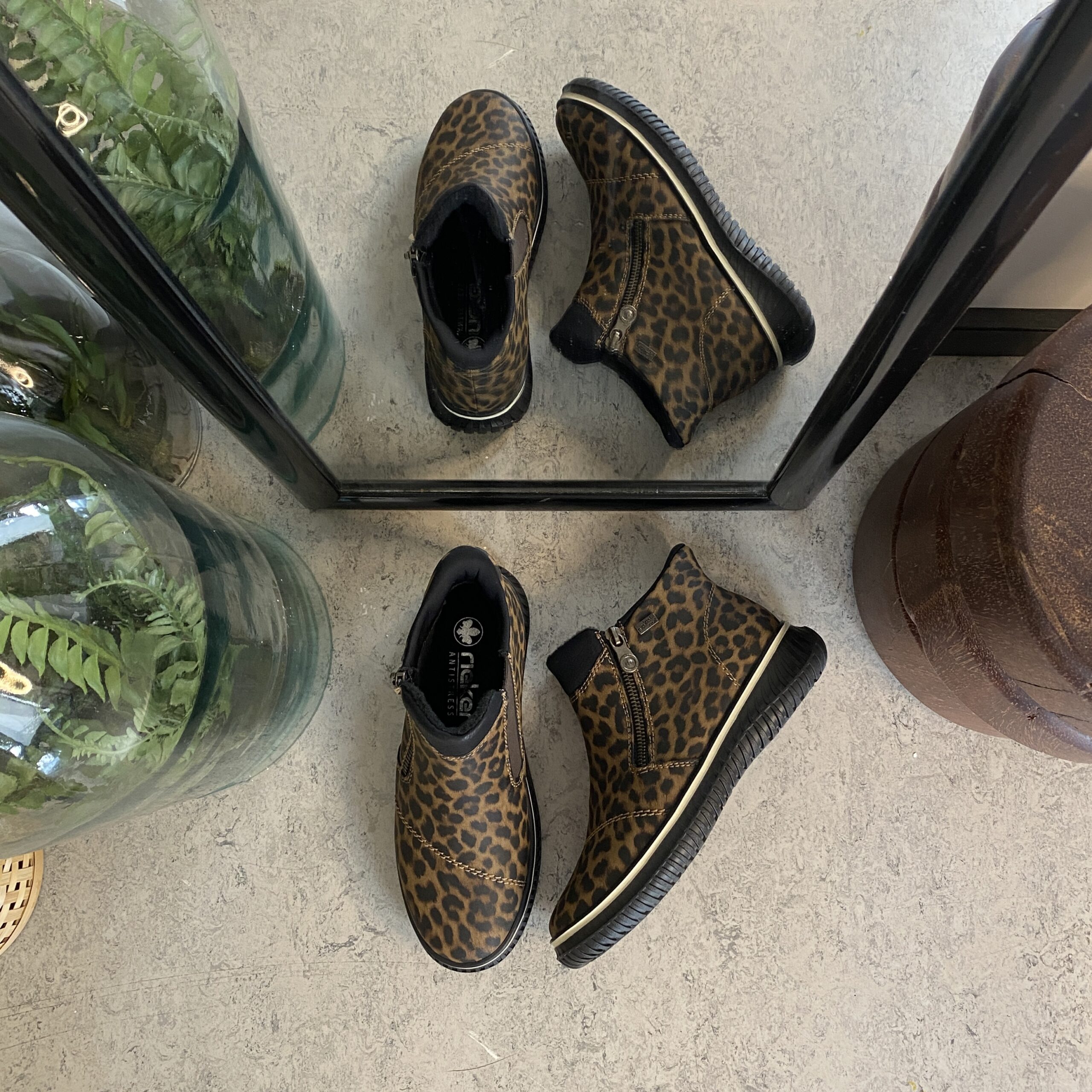 Denne Rieker støvle til damer med leo print kombinerer stilfuldt design med praktisk funktionalitet og komfort hele dagen.