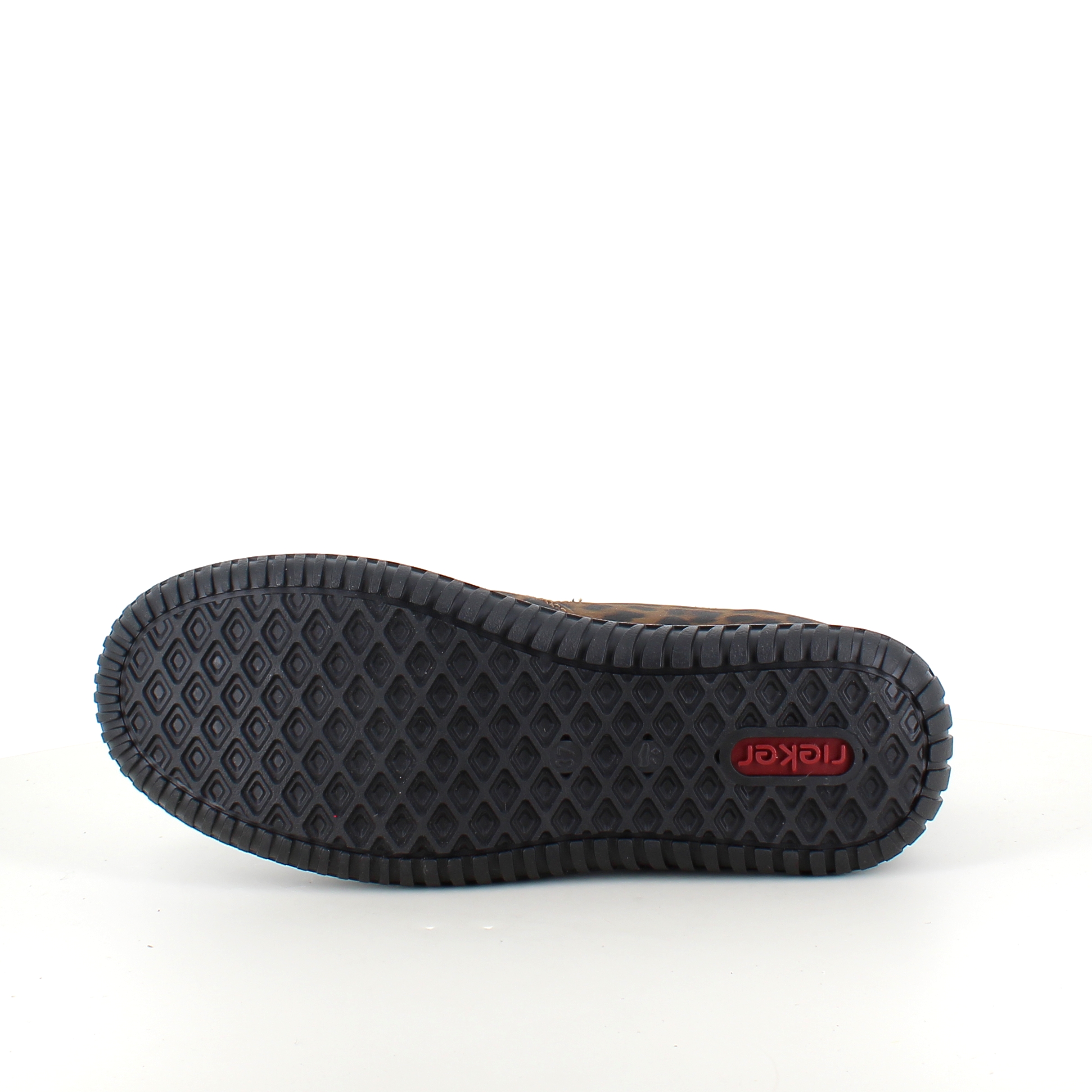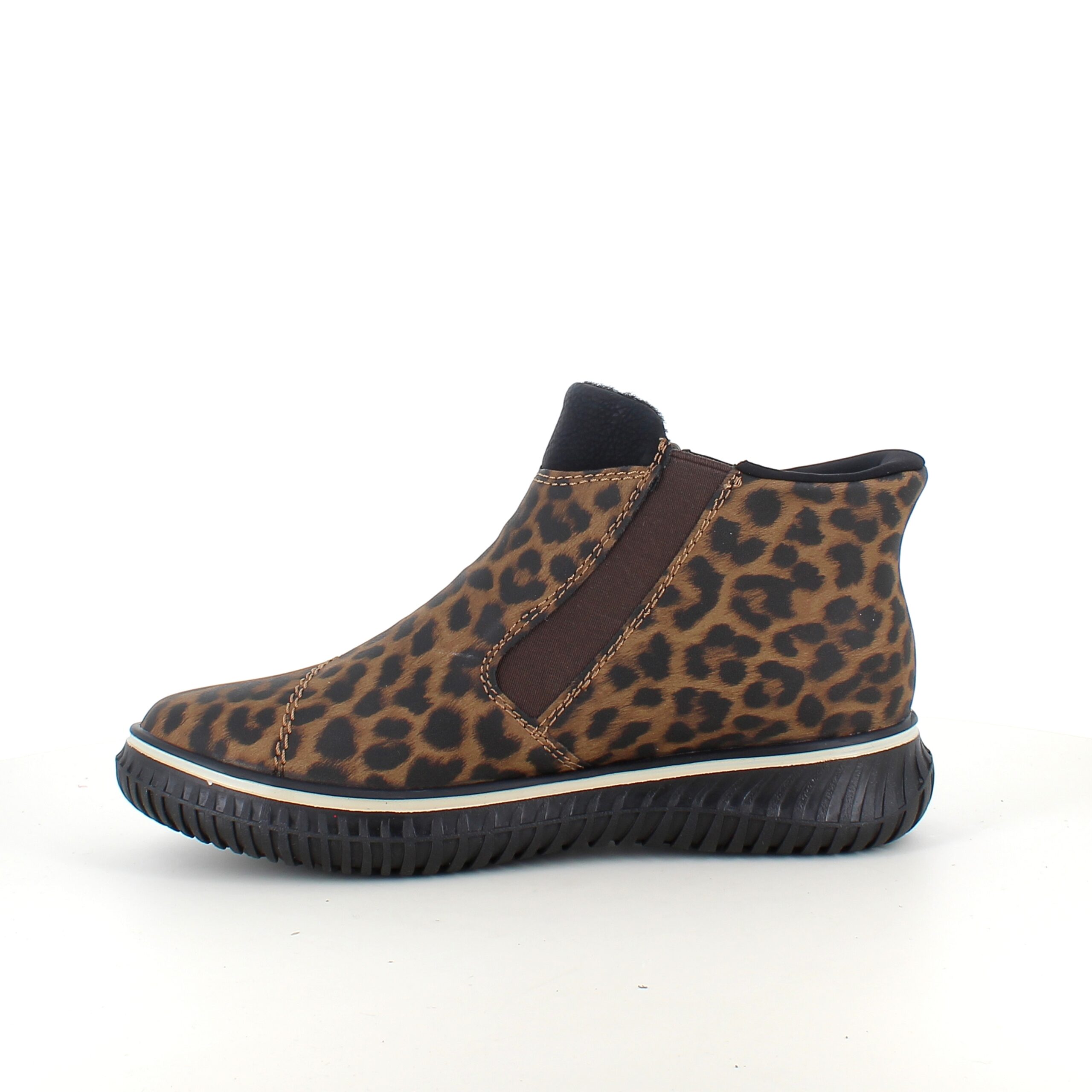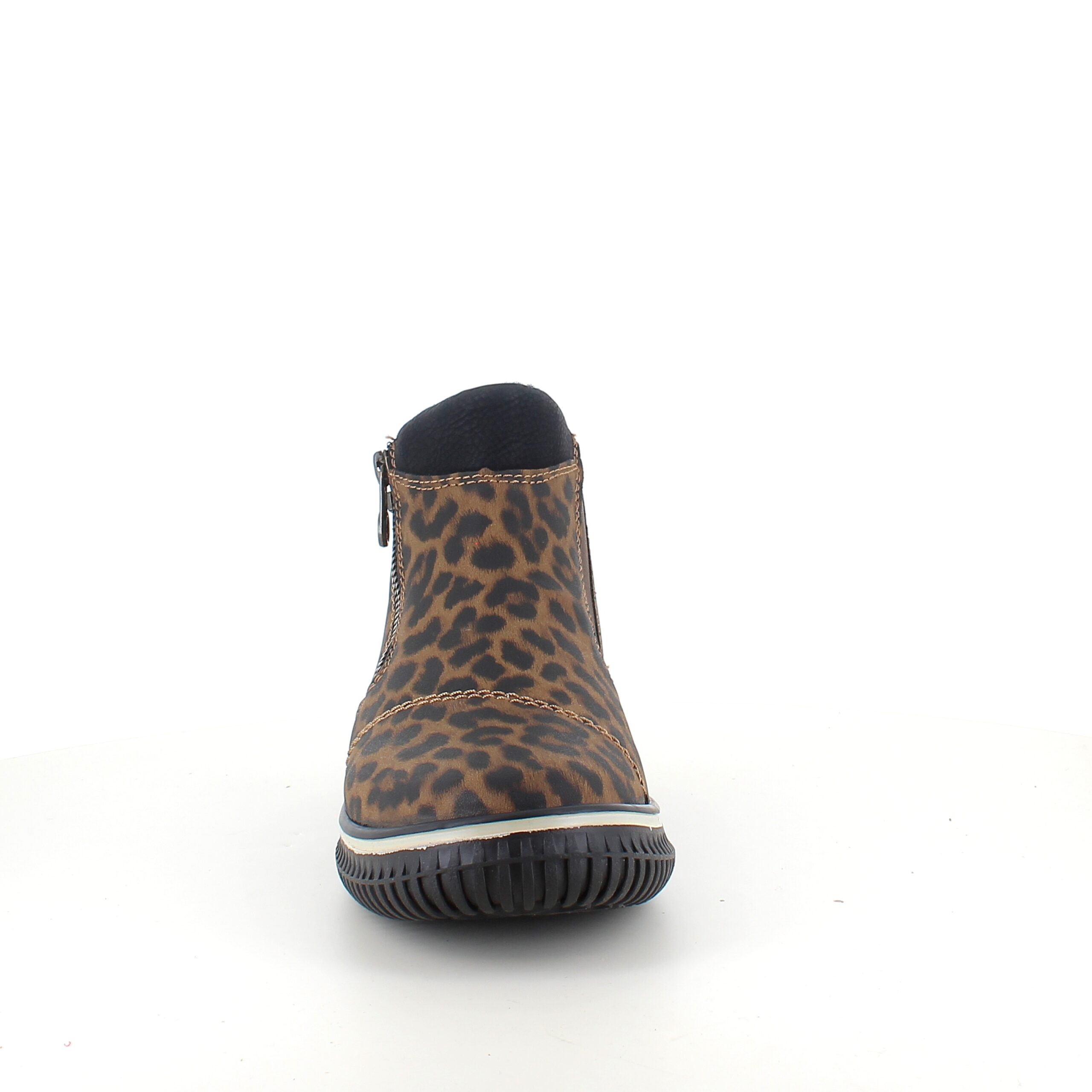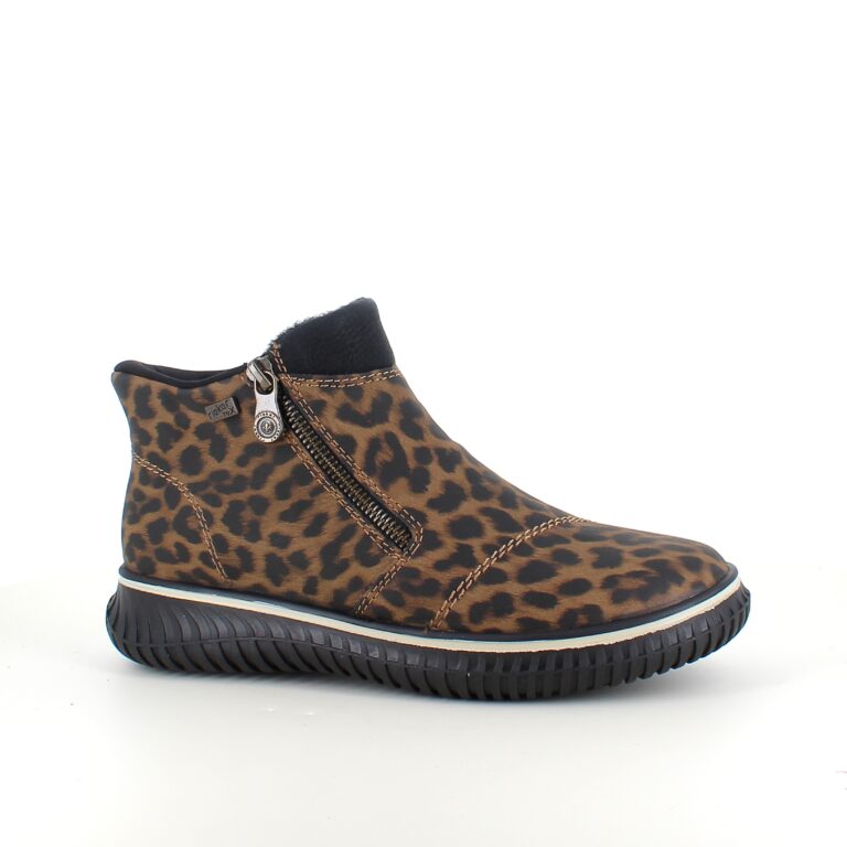 Denne Rieker støvle til damer med leo print kombinerer stilfuldt design med praktisk funktionalitet og komfort hele dagen.