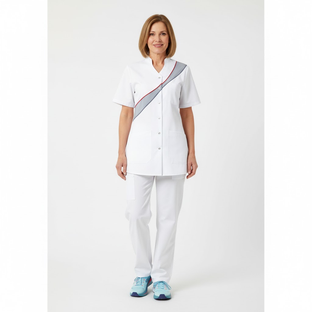 Nybo Workwear A/S præsenterer en hvid og grå dametunika, der udstråler både komfort og slidstyrke. Tunikaen er det perfekte valg til sundhedssektoren med to rummelige hoftelommer, hvor den venstre lomme er udstyret med en praktisk nøglestrop, mens den højre lomme har en dobbeltlomme til ekstra opbevaring. Den venstre brystlomme er ideel til kuglepenne, navneskilt og andre småting. Den stilfulde tunika har en udvendig nakkestrop og slidser i siderne, der sikrer maksimal bevægelsesfrihed. Lukningen foran består af trykknapper, specielt designet med flex fix-teknologi for at modstå industriel vask.