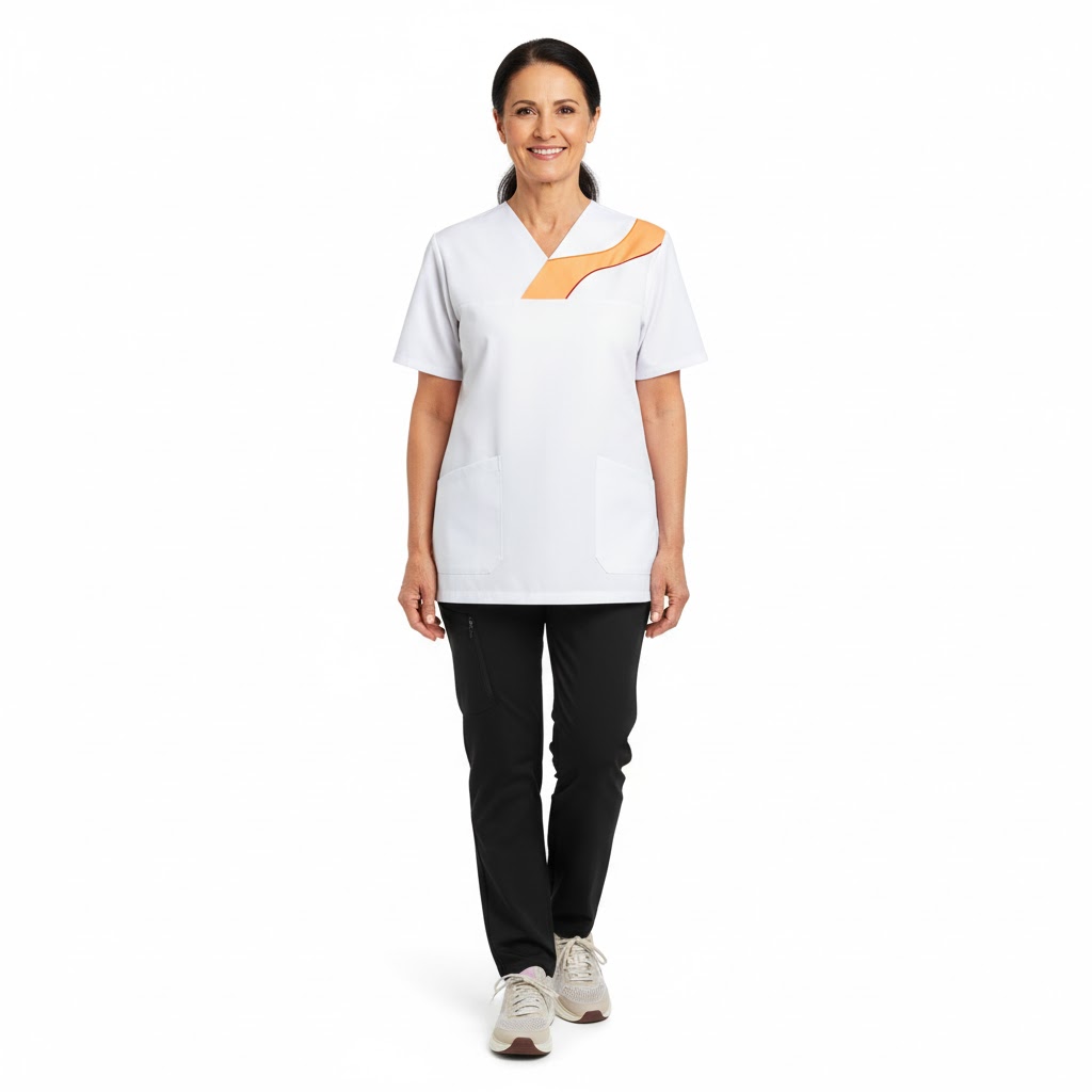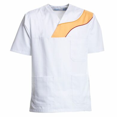 Fra kollektionen “Comfortec Satin” kommer dette klassiske design, der især henvender sig til sundhedssektoren. Denne serie er konstrueret med høj bomuldsandel mod kroppen for at sikre maksimal komfort hele dagen. De hvide overdele kan vælges med forskellige farvede besætninger, hvilket gør det muligt at tilpasse tøjet til virksomhedens logo, så busseronnen også kan bruges som CI-beklædning.