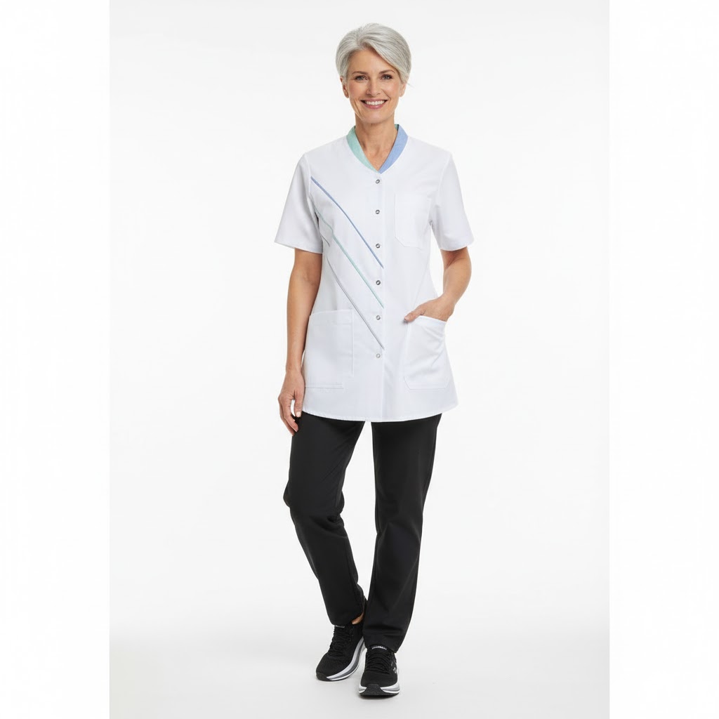 Nybo Workwear A/S præsenterer en elegant og funktionel dametunika, perfekt til professionelle i sundhedssektoren. Tunikaen, som fås i farverne hvid/lysegrøn/lyseblå samt hvid/orange/rød og hvid/rød/grå, er fremstillet i en kvalitetsmateriale-blanding af 50% polyester og 50% bomuld med en vægt på 215 g/m².