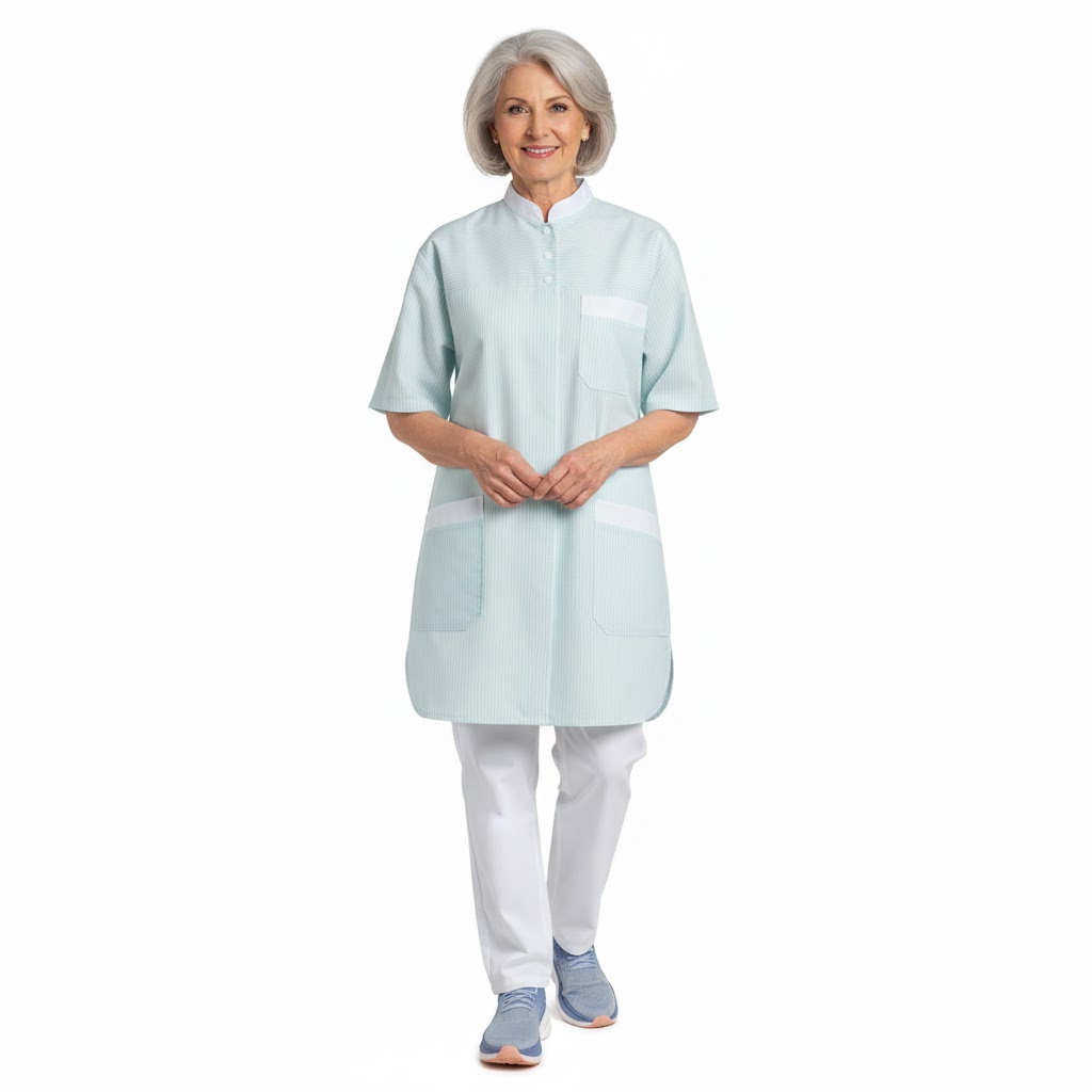 Kollektionen omfatter de nyeste stilrene designs, der kombinerer mode og funktionalitet. For dem, der foretrækker en anden farvepalet, findes denne model også i en elegant hvid-lyseblå version. Tunikaen er lavet af en holdbar blanding af polyester og bomuld, hvilket sikrer både komfort og lang levetid.