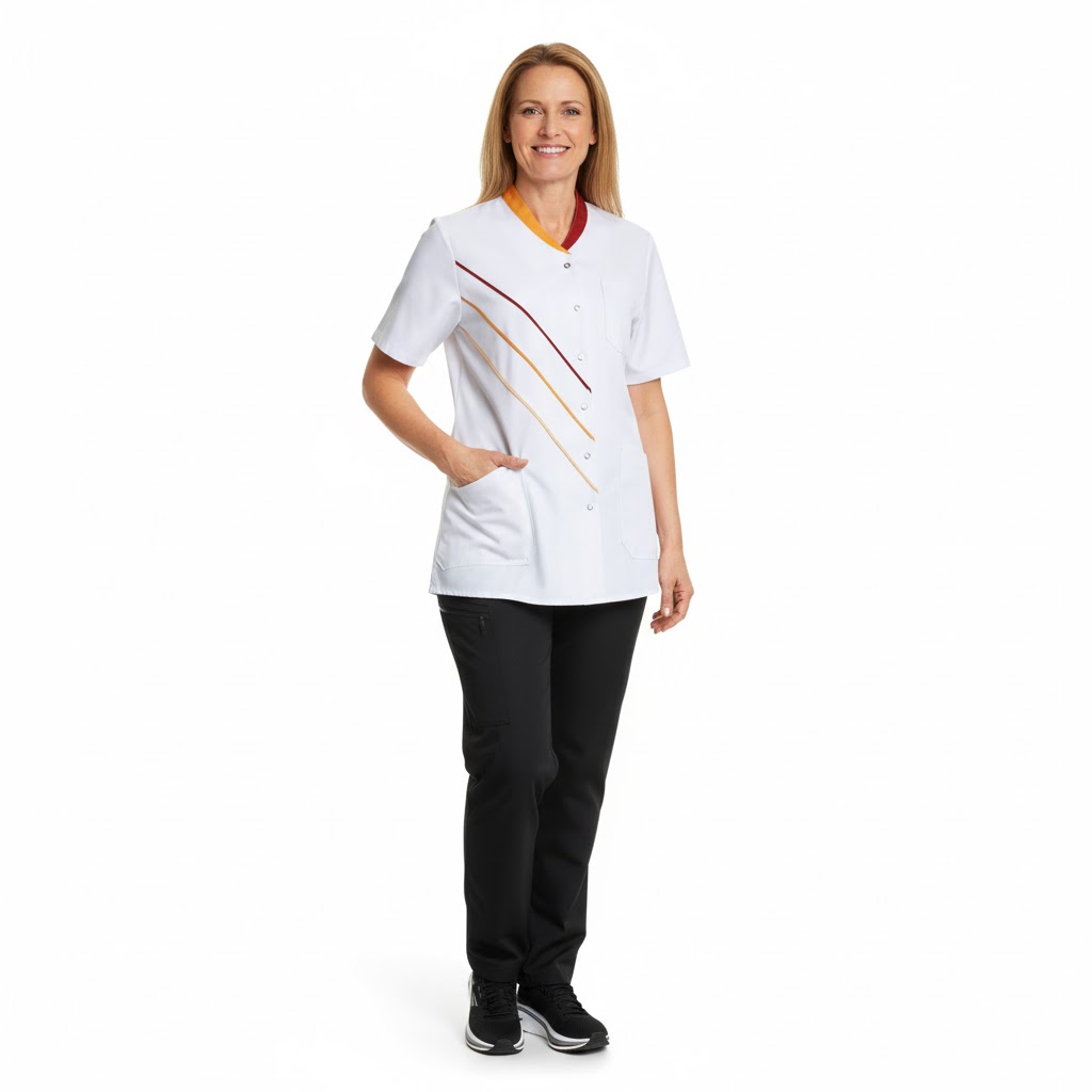 Denne tunika er tilgængelig i flere farvekombinationer, herunder Hvid/Lysegrøn/Lyseblå og Hvid/Rød/Grå, så du kan vælge den, der bedst matcher dine præferencer og arbejdsuniform.