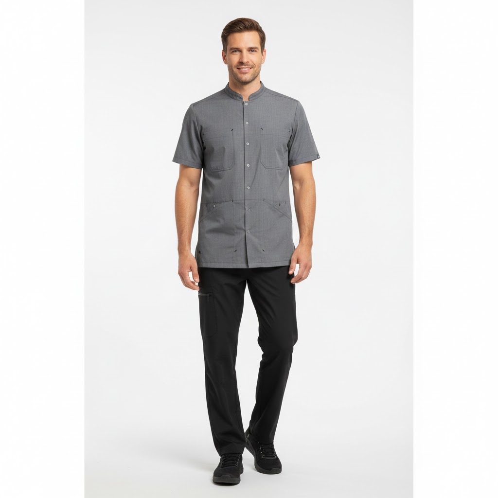 “Diskrete farver og en slidstærk vævning af genbrugs-polyester og økologisk bomuld” er nøgleordene for kollektionen, som denne skjorte er en del af. Kollektionen er designet til at signalere både faglighed og venlighed, hvilket gør den ideel til professionelle, der arbejder i service- og plejesektoren.