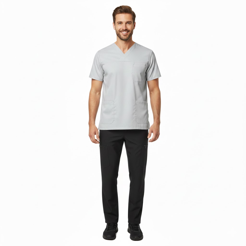 Den lysegrå variant er blot en af de mange farvemuligheder; den fås også i hvid, blå, navy, lyseblå, turkis, lysegrøn, rød, bordeaux, lys bordeaux, lys lilla, gul og orange, så der er noget for enhver smag. Alle modeller er klar til industriel vask, hvilket gør dem praktiske for erhvervsbrug.