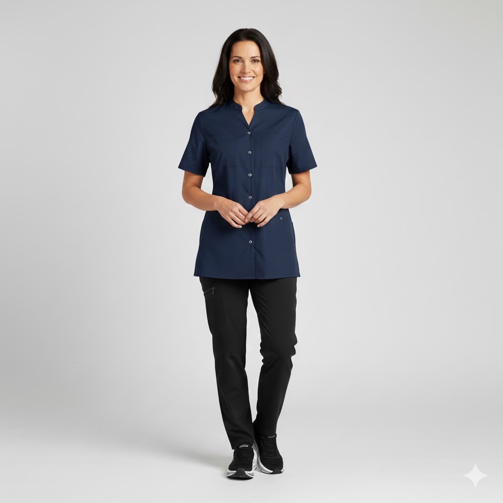 Ud over navy fås denne bekvemme og stilfulde dametunika også i farverne lyseblå, koksgrå, grøn og bordeaux, hvilket giver et bredt udvalg til enhver smag og arbejdsplads.