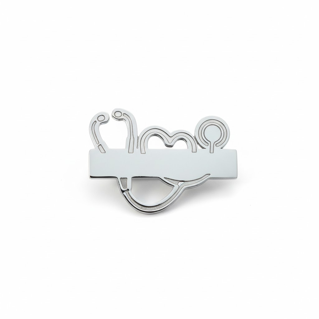 Stetoskop navneskilt i sølvfarvet stål – professionelt og personligt look til sundhedspersonale
